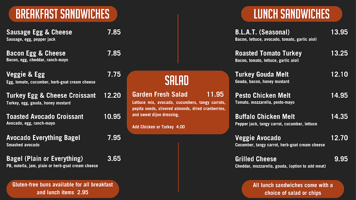 The food menu, filled with artisan lunch sandwiches, features standout options like the mouthwatering B.l.a.t and Turkey Gouda Melt. For a vegetarian delight, try the Veggie Avocado sandwich, perfect alongside a hot cup of their finest brew. Customers rave about the quality and presentation of the meals, making every visit a memorable one.